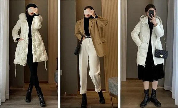 The CP of white down jacket must be black, and the combination of black and white is classic. Don’t forget the details such as the trouser leg tucked into the boot sleeve!
